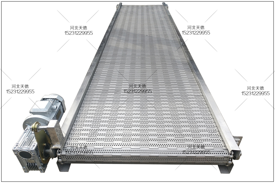 這臺(tái)鏈板不銹鋼輸送機(jī)的總長(zhǎng)度為5米,輸送機(jī)總寬度為0.8米,沒(méi)有腿,客戶自己根據(jù)需要在焊 接機(jī)腿。采用3.0毫米厚度的鋼板折彎加工成的機(jī)身,不銹鋼鏈板輸送帶的板厚為2.0毫米,輸送鏈條節(jié)距為38.1毫米,桿直徑為8毫米,鏈板輸送帶表面打孔的直徑為3.0毫米。配套使用的鏈輪為直徑120毫米左右的。電機(jī)采用0.75千瓦電機(jī),配套使用的減速機(jī)、變頻器都會(huì)安裝好。
